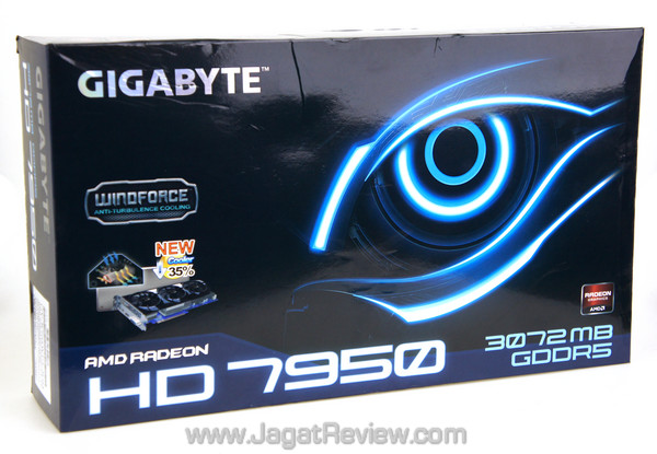 Kebebasan   yang diberikan AMD ternyata disambut hangat oleh salah satu produsen hardware komputer,   Gigabyte. Alih-alih merilis versi reference, Gigabyte terjun langsung ke   medan persaingan graphics card Tahiti Pro dengan menggunakan AMD HD 7950 yang   memiliki spesifikasi clock lebih tinggi dan sistem pendingin non-reference   andalan mereka. Mari kita lihat kiprah graphics card yang bernama Gigabyte HD   7950 Windforce 3X ini.